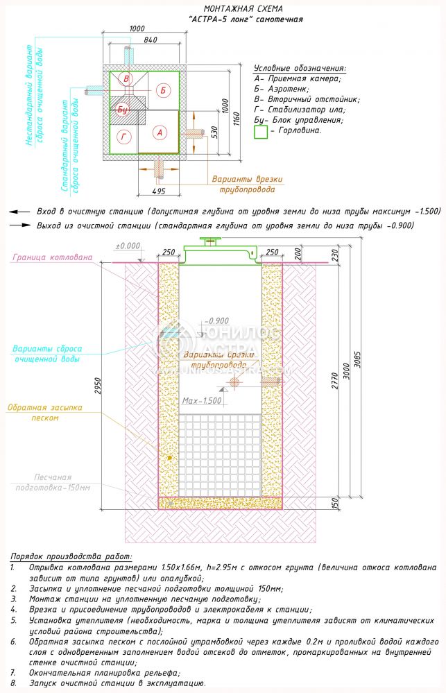 Согласно предоставляемой в комплекте с септиком Юнилос Астра 5 long документации, очистка стоков в устройстве осуществляется максимально полно. На выходе из установки вода имеет прозрачный цвет, характеризуется полным отсутствием запахов и даже (после дополнительного обеззараживания, например – хлорирования), может применяться в качестве технической жидкости, для полива деревьев растений, мытья садовой мебели и т.п. Сброс очищенной воды в грунт не наносит никакого экологического вреда окружающей среде, полностью соответствует установленным нормам и стандартам качества организации загородной жизни.
