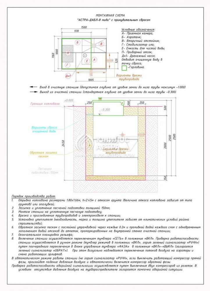 Установка септика ЮНИЛОС «АСТРА-8 миди» целесообразна при залегании входящей канализационной магистрали на глубине от 0,6 до 0,9 м.